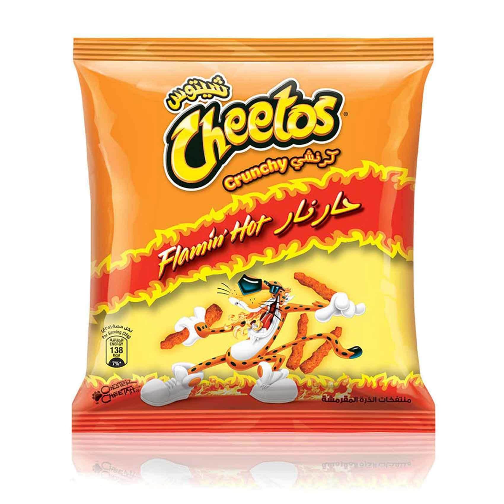 Calories in Cheetos | CalorieKing Puffs Cheese Snack. Crunchy Cheese Snack. Flamin' Hot Puffs Cheese Snack. Xxtra Flamin' Hot Crunchy Cheese Snack. Baked!, Flamin' Hot Cheese Snack. Cheddar Jalapeno Crunchy Cheese Snack. Simply Natural, White Cheddar Puffs Cheese Snack. Twisted Puffs Cheese Snack. Crunchy Flamin' Hot Top N Go Walking Taco.