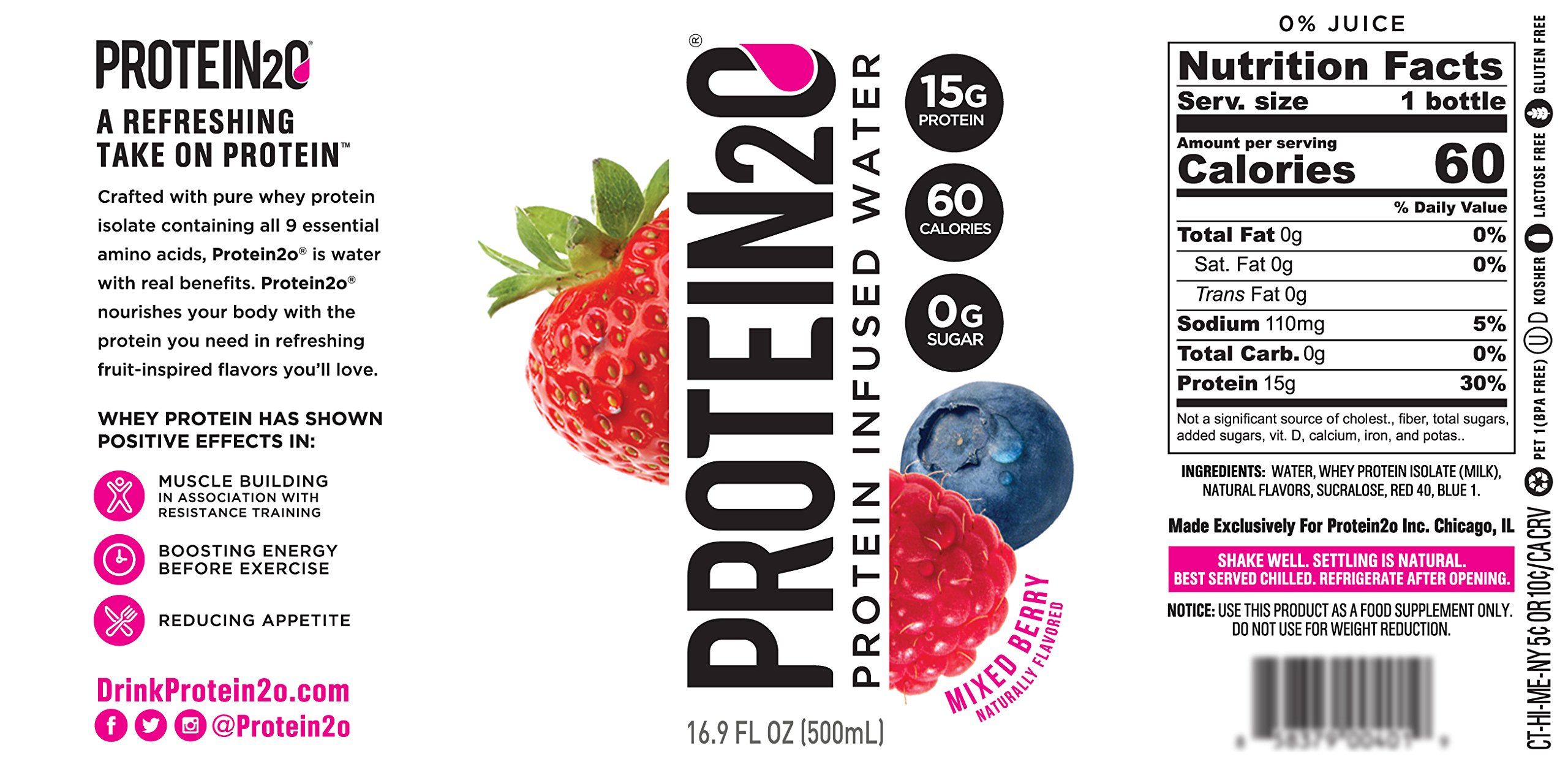 Protein2o Water | 15-20G Whey Protein Isolate, Lower Calorie, Zero Sugar Protein2o Water | 15-20G Whey Protein Isolate, Lower Calorie, Zero Sugar Delicious. Refreshing. On-The-Go. BUY NOW only at Costco THE MOST REFRESHING WAY TO POWER THROUGH THE DAY. Protein2o. All the benefits of protein to fuel your healthy lifestyle made in refreshing fruit-flavored waters and convenient on-the-go powder packs. Amazon.com : Protein2o 15g Whey Protein Infused Water, Wild Cherry, 16. ... 15g whey protein isolate, 0g sugar, 70 calories, 4g carbs Ion-exchange whey protein isolate rich in BCAAs Highest Leucine content of any known protein, necessary for muscle protein synthesis Certified OU-D Kosher, gluten free, lactose free, no artificial flavors, preservative free and BPA-Free Protein2o Protein Infused Water Blueberry Raspberry Macro Nutrition ... Keto & Health Insights for Protein2o Protein Infused Water Blueberry Raspberry. Net Carbs are 3% of calories per serving, at 2g per serving.This meal falls within the range for standard keto diet guidelines (at or under 25g of net carbs). If your daily net carb quota is 25g and if this food almost equals that much, consider whether you're going to eat more food later. Amazon.com : Protein2o 15g Whey Protein Infused Water, Mixed Berry, 16. ... Protein2o 15g Whey Protein Infused Water Plus Electrolytes Merchant Video Important information Safety Information This product is labelled to United States standards and may differ from similar products sold elsewhere in its ingredients, labeling and allergen warnings Ingredients 15g whey protein isolate, 0g sugar, 60 calories, 0g carbs