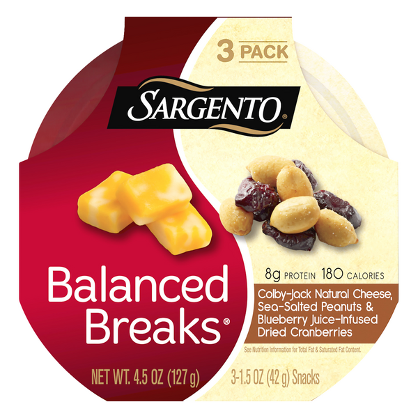 Balanced Breaks® | Sargento LESS THAN 200 CALORIES. * See Nutrition Information For Total Fat And Saturated Fat Content. Not a low calorie food. ... Sargento® Balanced Breaks®, Monterey Jack Natural Cheese, Apple Juice-Infused Dried Cranberries and Shelled Pumpkin Seeds . Sargento® Balanced Breaks®, Natural Double Cheddar Cheese, Dried Cranberries and Salted Walnuts ...
