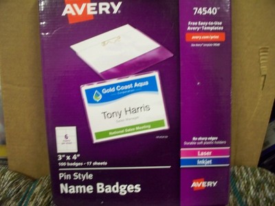 Avery 74540 Pin Style Names Badges 3 x 4" | Nordisco.com Avery 74540 3 x 4" pin style name badges. Make professional-looking name badges using inkjet or laser printers with these Pin-Style Name Badges. No sharp edges, durable top loading soft plastic holders. These badge holders are ideal for meetings, seminars, conventions and other events. The 8-1/2" x 11" microperforated insert sheets tear cleanly.