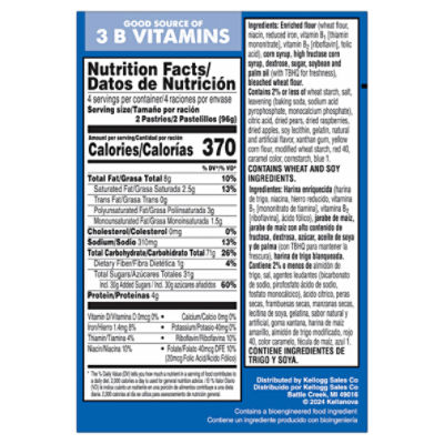 Nutrition Facts for Pop-Tarts Unfrosted Blueberry Toaster Pastries ... Nutrition Facts Serving Size pastries 2 pastries = 96g Amount Per Serving 380 Calories % Daily Value* 15% Total Fat 10g 18% Saturated Fat 3.5g Trans Fat 0g 0% Cholesterol 0mg 16% Sodium 360mg 23% Total Carbohydrate 69g 4% Dietary Fiber 1g Total Sugars 25g 48% Includes 24g Added Sugars Protein 4g 0% Vitamin D 0mcg 0% Calcium 0mg 8% Iron 1.5mg