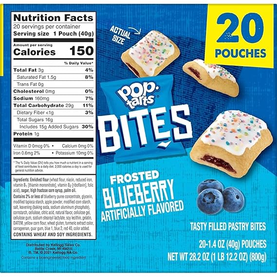 Kellogg's Pop-tarts Blueberry 14.7oz Nutrition Facts - GroceryNutrition.org Kellogg's Pop-tarts Blueberry 14.7oz contains the following ingredients: Enriched flour (wheat flour, niacin, reduced iron, vitamin b1 [thiamin mononitrate], vitamin b2 [riboflavin], folic acid), corn syrup, high fructose corn syrup, dextrose, soybean and palm oil (with tbhq for freshness), bleached wheat flour, contains two percent or less of ...