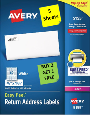 Avery 5155, Avery Easy Peel Return Address Label, AVE5155, AVE 5155 ... Each sheet includes 60 labels that each measure 1-3/4" wide x 2/3" high. Item #: AVE5155 Great for address labels, labeling bottles, Ball and Mason jars and more Sure Feed technology for a reliable feed through your printer Easy Peel label sheets with Pop-up Edge for faster peeling Smudge-free and jam-free guaranteed