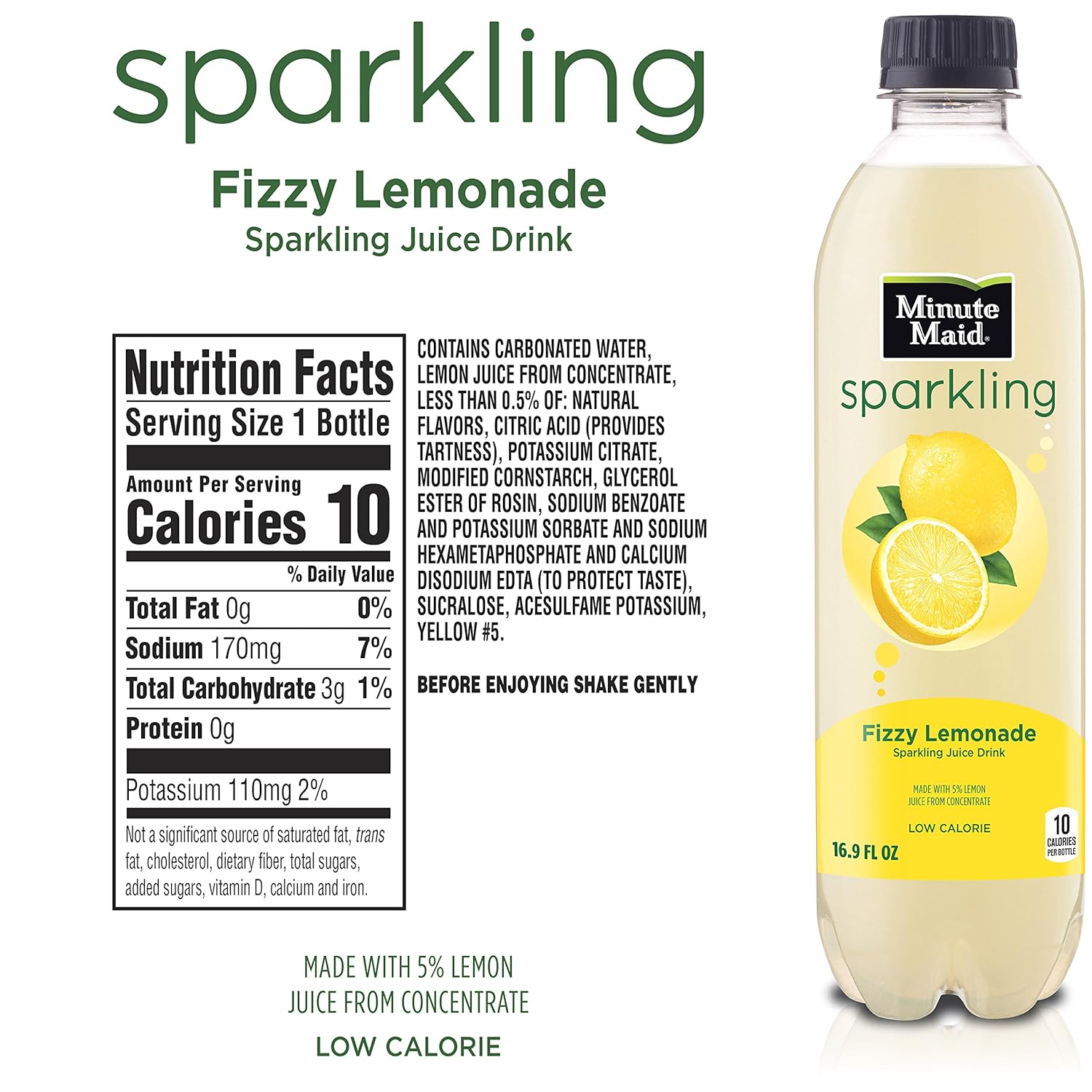 Calories in Minute Maid Sparkling Fizzy Lemonade and Nutrition Facts Minute Maid, Sparkling Fizzy Lemonade, Nutrition Facts, Serving Size, 1 bottle (16.9 oz) Amount Per Serving, Calories, 10, % Daily Values*, Total Fat, 0.00g, 0%, Saturated Fat, 0.000g, 0%, Trans Fat, -, Cholesterol, -, Sodium, 170mg, 7%, Total Carbohydrate, 3.00g, 1%, Dietary Fiber, -, Sugars, -, Protein, 0.00g, Vitamin D, -, Calcium, -, Iron, -,