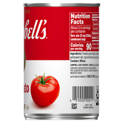 Calories in Tomato Soup and Nutrition Facts - FatSecret Tomato Soup Nutrition Facts Serving Size 1 cup Amount Per Serving Calories 102 % Daily Values* Total Fat 2.93g 4% Saturated Fat 0.988g 5% Trans Fat - Polyunsaturated Fat 0.988g Monounsaturated Fat 0.727g Cholesterol 5mg 2% Sodium 705mg 31% Total Carbohydrate 17.93g 7% Dietary Fiber 1g 3% Sugars 10.54g Protein 3.05g Vitamin D - Calcium 49mg 4% Iron Campbell's® Classic Condensed Tomato Soup - Campbells Food Service Nutrition Facts: About 11 Servings Per Container: Serving size: 1/2 Cup (120mL) Condensed Soup: Amount per serving: Calories 90 % Daily Value *; Total Fat Campbell's Sipping Soup, Classic Tomato Soup, 11.1 Ounce ... Take the classic flavors you know and love on the road with Campbell's Sipping Classic Tomato Soup. Every sip of this comforting tomato vegetable soup is crafted with the simple, delicious ingredients you grew up on. The tangy taste of tomato puree makes this soup a delicious and nostalgic choice anytime, anywhere. tomato soup Nutrition Information - Self Food Search: tomato soup nutrition facts and information in Home ... CAMPBELL'S SELECT Gold Label Soups, Italian Tomato & Basil Soup. Add to Tracking Add to Compare Create Recipe Add to My Foods. CAMPBELL Soup Company, CAMPBELL'S SELECT Soup, Harvest Tomato with Basil Soup.