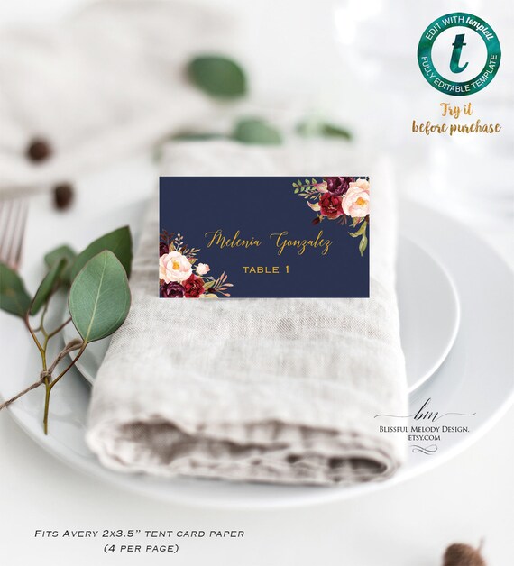 Printable Burgundy Floral Navy Gold Tent Place Card Template ...