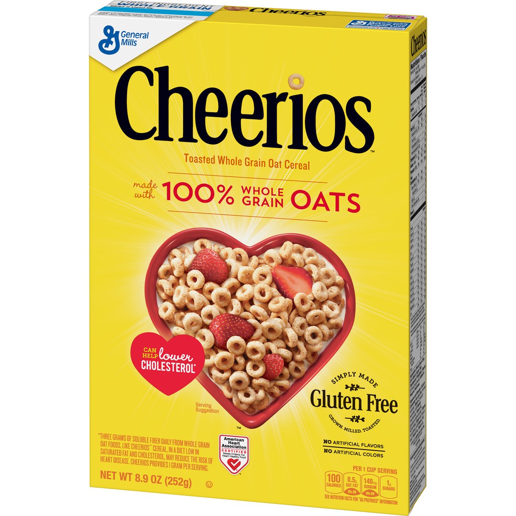 Cheerios - Brands - Food we make - General Mills From your first finger food, to helping lower cholesterol, Cheerios has touched the lives, and breakfasts, of millions by spreading heart-healthy cheer since 1941. Food that matters We put the best ingredients in every bite so that everyone can enjoy a bowl of Cheerios. 100% whole grain oats Real honey Gluten free Fun facts about Cheerios