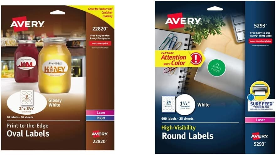 Amazon.com: avery labels 22820 Avery Print-to-The-Edge Glossy Oval Labels, True Print, 2" x 3.3", Pack of 80 Oval Labels (22820) & High-Visibility White 2.5 Round Labels, 300 Pack (5294) $2011$36.48 FREE delivery on $25 shipped by Amazon. Avery Printable Blank Oval Labels, 1-1/8" x 2-1/4", Textured Matte White, 63 Customizable Labels (80502) 4.6 (934) $837 ($0.13/Count)