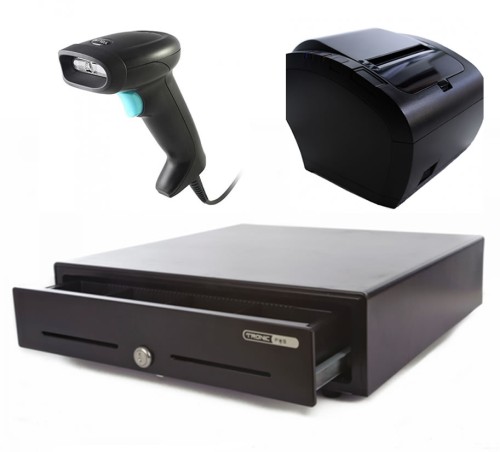 POS Starter Bundle. Corded laser barcode scanner, 80mm thermal receipt printer, cash drawer and receipt rolls.